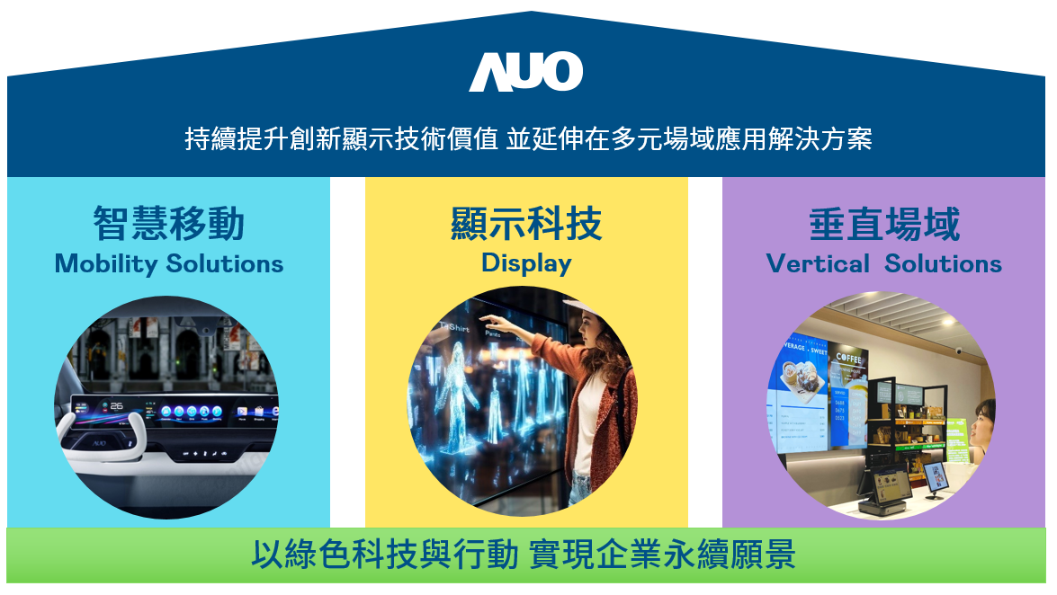 我們持續推動「雙軸轉型」,在精進顯示技術附加價值(Go Premium),與深化垂直市場應用(Go Vertical)的策略下,對應九游会ag登录j9入口的優勢競爭力與趨勢,我們奠定顯示技術、智慧移動、垂直場域三大永續營運支柱,在顯示技術領域的根基之上,延伸布局多元場域應用解決方案。將先進顯示科技助力智慧移動及垂直場域發展,並以綠色科技與行動為實踐,在轉型之路上貫徹永續經營之願景。